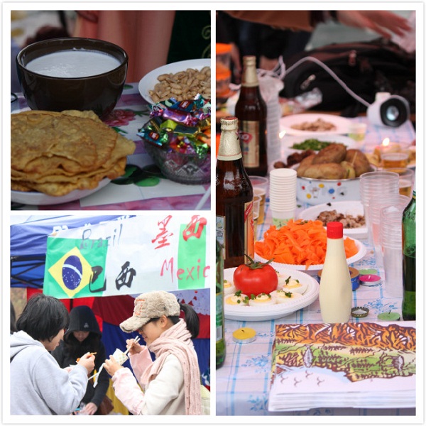 从11月23日到12月30日,本次国际文化节将持续进行一个多月,在此期间外语学院将举办以外国语言文化为主题的各类比赛和交流活动,下午三时许,游园会在文化广场上如火如荼地展开。尽管天气寒冷,但同学们依然表现得热情高涨。泰国展台为大家提供了温暖的奶茶和稀饭,俄罗斯展台向大家教授俄语的日常用语,中国展台向大家展示中华茶文化与书法艺术,身着各国民族服装的留学生向求是学子展现了语言、饮食、服饰等各类异国文化,吸引大批学生驻足。同时,由各国留学生和学生社团所开展的吹气球、对对联、记单词等互动环节使得活动场地的气氛更加热烈。此外,舞台上还有毽球社等学生社团组织开展踢毽子、古琴演奏等各类文艺活动。
