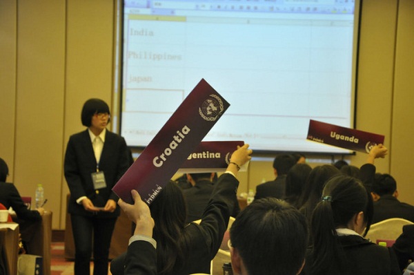 精彩的开幕式后,29日下午代表们迎来了他们的第一个分组会议。此次模拟联合国会议的会场设置在紫金港大酒店和紫金港国际大酒店。早在正式会议开始前,大会组委会的工作人员即来自浙江大学模拟联合国协会的同学已经将一切准备就绪,等待代表们的到来。同时,每个委员会的主席团均是由来自浙江大学的优秀学生组成,他们经历了层层选拔和近七个月的准备,为能给代表们提供一次学术与思想交流的盛宴做出最大的努力。在会场上,代表们认真发言、讨论的场景随处可见。