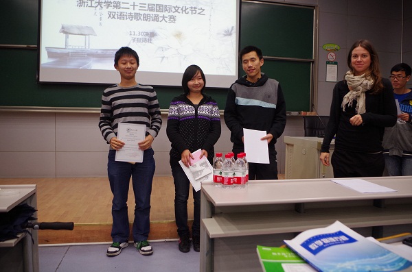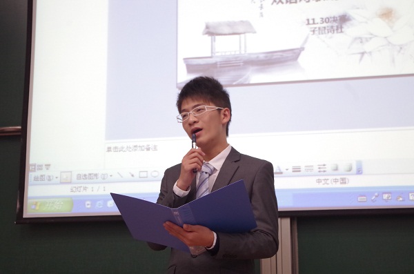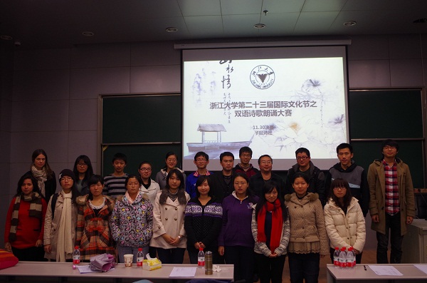 2012年11月23日,第二十三届国际文化节在秋末的紫金港揭开了帷幕。在开幕式现场火热无比的同时,在东2-104大教室正如火如荼地进行着国际文化节的活动之一——子鼠诗社双语诗歌朗诵大赛的初赛。