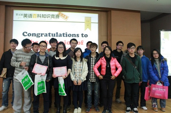 本届“英语百科知识竞赛”正值比赛五周年庆,不仅获得浙江大学最具人气英语比赛荣誉,并且盛况空前的总决赛现场也吸引到了浙江大学电视台前来报导。值得一提的是,本届奖品的丰厚力度前所未有,不仅有电子词典、MP3、名表等高科技奖品,总冠军还获得寒假赴香港免费游学的机会。“英语百科知识竞赛”的受欢迎程度、比赛规模和影响力,突破了以往任何一届英语学科竞赛,成为浙大史上一个新的记录,外语协会除了感到由衷的自豪,也祝贺忙碌了一个学期的工作团队。同时,“英语百科知识竞赛”在社团文化节精品活动评比中荣获奖项,比赛副项目经理顾嘉希同学将出席颁奖晚会。