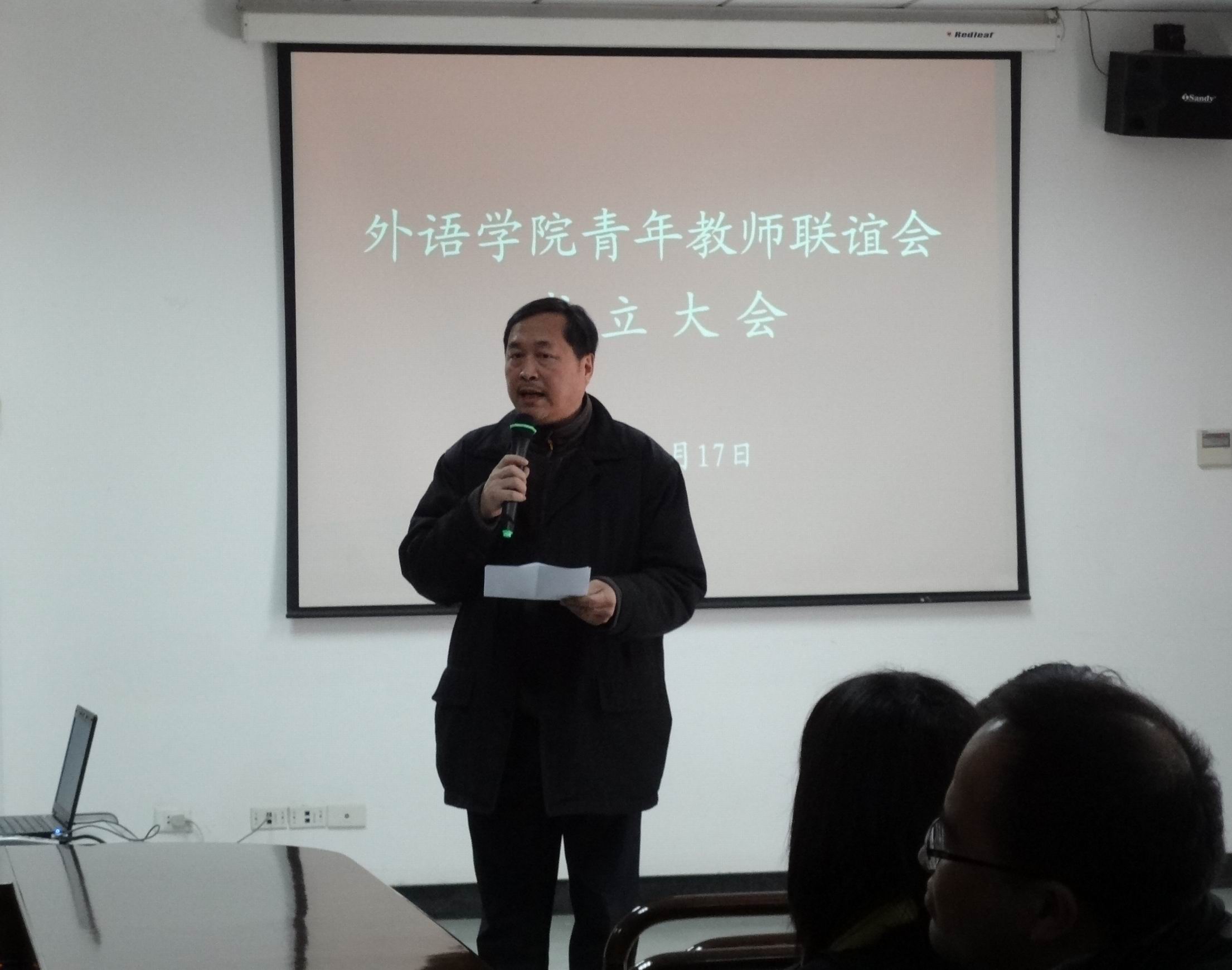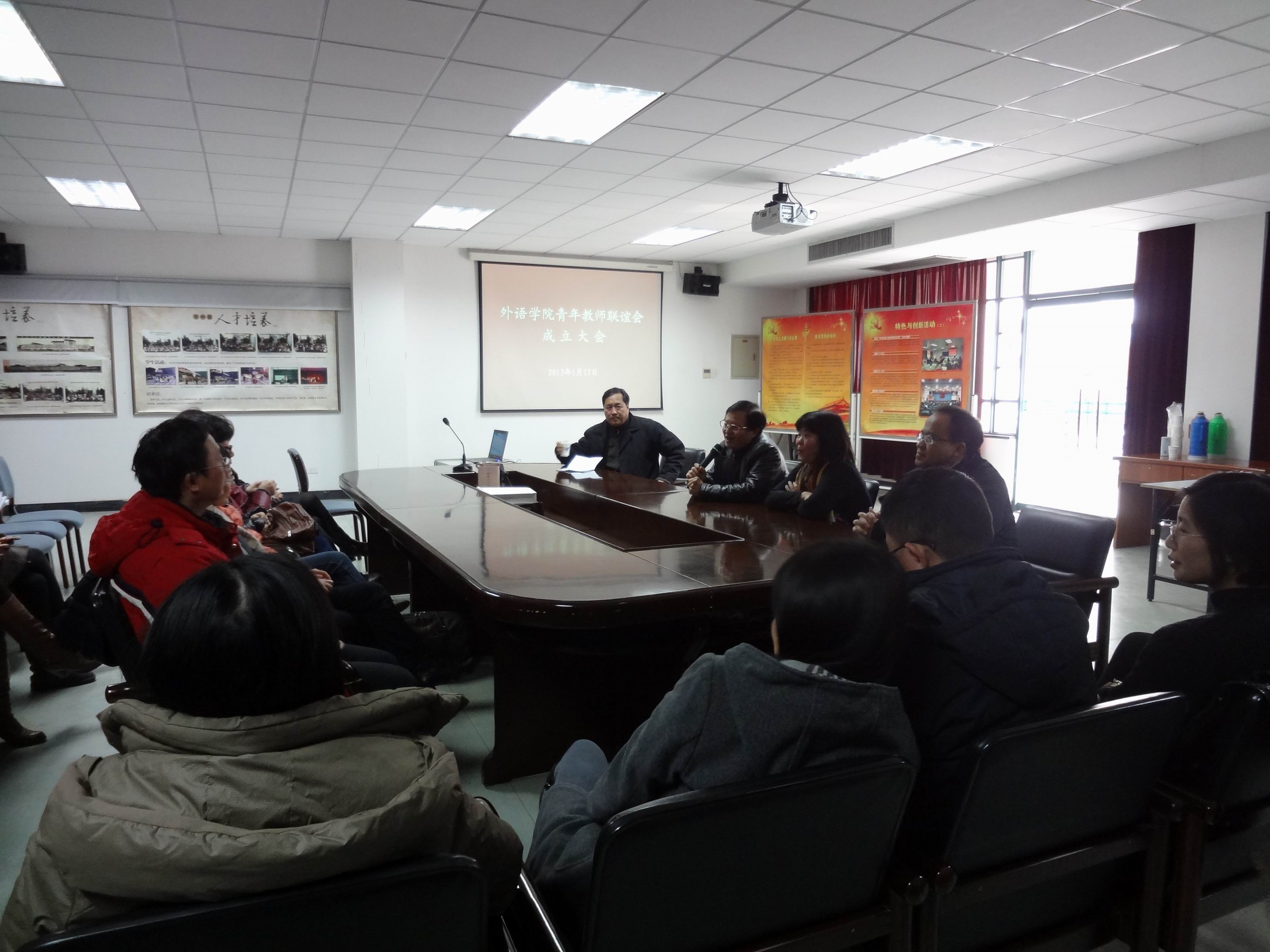 2013年1月17日下午,在院工会的极力倡导下,外语学院青年教师联谊会成立。院工会主席吴昶老师介绍了联谊会成立的初衷,院青年教师联谊会是依托学院青年教师创新平台而成立的一个群众组织,旨在加强青年教师之间的联系和交往,通过形式多样的活动,增进感情、增加沟通和促进发展,希望能为全院青年教师营造一个轻松、活跃又不失温暖的一个交流平台。院党委书记胡松法老师到会讲话,希望更多的年轻教师能融入到青年教师联谊会这个大家庭,一起交流、共同成长。