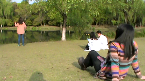 夕阳西下,一名女生坐在湖边用羡慕的眼神看着前方拉小提琴的女子,在悠扬的琴声中回忆自己以前的故事。在她的身后,举着DV的同学正在辛苦的取景,构思最好的角度。这里正是德语1101班主题微电影的拍摄现场。