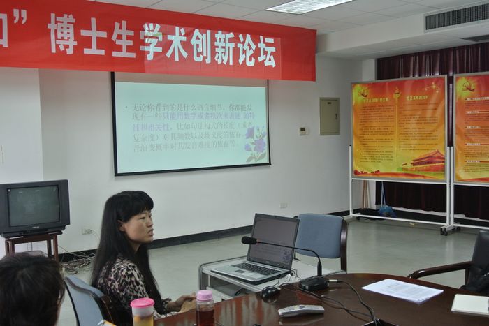 首期“格物致知”博士生学术创新论坛共邀请两名博士生与大家交流、分享近期科研进展。首先,12级博士生章红新作了主题为“计量句法分析”的学术报告。她详实的比较了定性与定量的研究方法;介绍了计量研究的历史;同时,结合实例解读了计量句法研究的五步。展示过程中她运用各种辅助材料及信息,深入浅出的介绍了该领域的相关研究进展,令在场的各位研究生耳目一新。