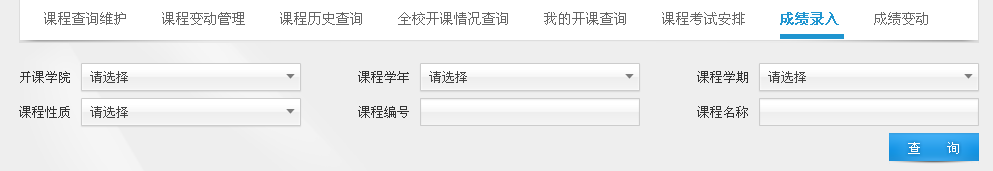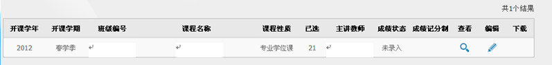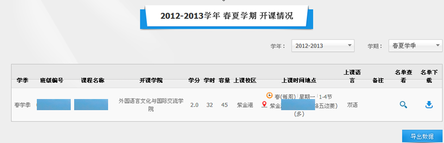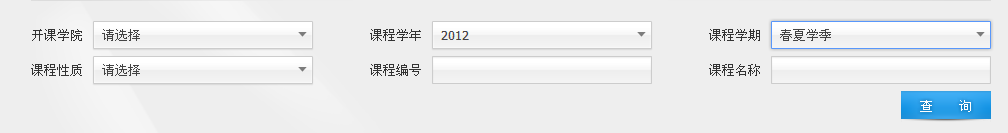 在上图相应栏内下拉菜单中选择课程开课学年(开课学年请录入前一个年度:如2012-2013学年春夏季课程,就选择2012),选择开课学期,可以不输课程编号和名称(当然输入最好,查得更准确),直接点击查询,就会显示您在该学年该学期所开的所有课程。