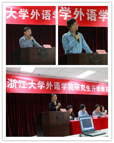 外语学院党委书记褚超孚教授首先发表了讲话。他先代表学院向全体新同学表示了热烈欢迎,并介绍了外语学院学科设置。学院现在从量的扩张转向质的发展,科研发展势头喜人。在致辞中,褚书记对所有研究新生提出了两点要求:首先,无论是做人还是做学问都要踏踏实实,不能被功利蒙蔽心灵,要本着浙江大学求是务实的精神做学问;其次,要有独立意识和集体意识,研究生不同于本科生,不再只是单纯的跟从老师读书学习,而是沉心静气,敢于孤独,敢于沉思。作为研究生的关键则是能不能和导师团队一起产生新的思想。研究生教育旨在培养大家成为会思考会批判的,有独立人格的人,而外语学院更是提倡学生们出国进修,培养国际视野,学院的努力方向是国际化的管理,最后达到大学理念回归和人才理念回归。