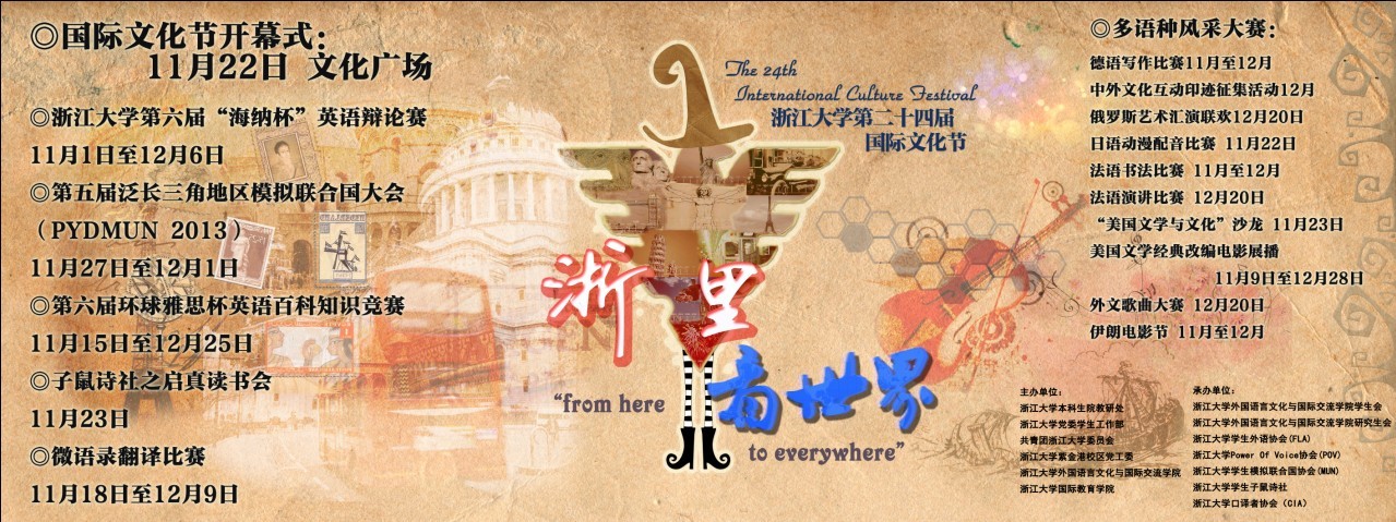 第二十四届国际文化节开幕式将于2013年11月22日(周五)在浙江大学紫金港校区文化广场隆重开幕。届时各国风俗文化在此荟萃,不仅有中国学生参与其中,还有来自印度尼西亚、德国、巴林、韩国、泰国、马来西亚、丹麦、挪威、伊朗等不同国家的留学生们,通过多样的展台互动形式展现给同学们。本届文化节的开幕式将创造很多互动环节,为中国学生和留学生搭建友谊桥梁。这不仅是一个隆重的开幕仪式,更是一场精彩的视觉盛宴!国家风情展台展示将于下午4:00开始,让师生充分感受异域风情;晚6:00开始正式的启动仪式;紧接着就是一直为大家所喜爱的各民族风俗节目表演,如泰国民族舞蹈、各国风情走秀、武术等等。