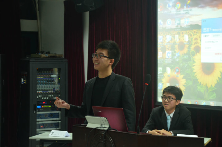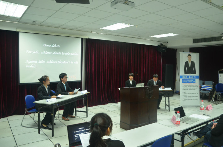 之后,主持人为各参赛选手及嘉宾介绍了比赛组织形式以及赛程安排。由于本届海纳杯英语辩论比赛首次采用全新的美式公共论坛辩论制,为了使参赛选手更加清晰地理解赛制,主办方Power Of Voice协会准备了一场以“Athletes should/should not be role models ”为主题的模拟辩论,使选手们更直观地了解了新赛制。模拟辩论后,主持人指出辩论中的需要注意的事项,以提醒选手。