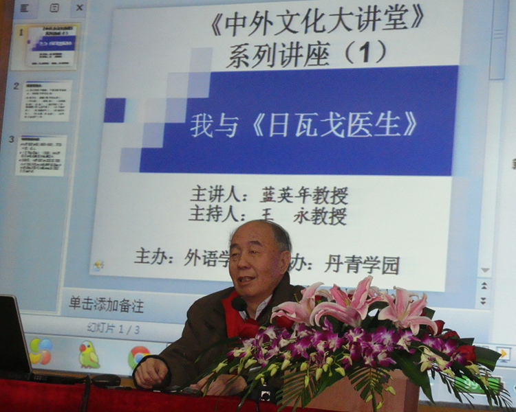 2013年11月29日15:30分,北京师范大学教授、中国作家协会会员、俄苏文学研究专家蓝英年先生来到浙江大学国际会议中心138室报告厅,做客由外语学院主办、丹青学园协办的《中外文化大讲堂》,为我校广大师生做了题为“我与《日瓦戈医生》”的精彩讲座。讲座由浙江大学外语学院副院长王永教授主持。