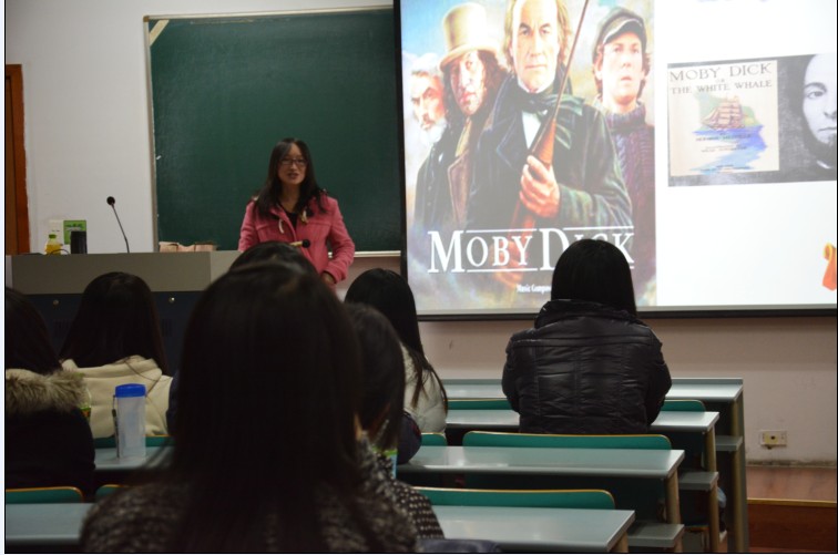 本期展播由美国文学研究中心成员、外语学院12级硕士王美地主持,她首先简短地介绍了影片《白鲸记》。《白鲸记》改编自美国著名作家赫尔曼·梅尔维尔的同名小说。继1930年后,该小说于1956年被再次搬上大荧幕,由老牌导演约翰·休斯顿(John Huston)掌舵,格利高里·派克将高傲倔强的亚哈(Ahab)船长塑造得入木三分。本片的海上历险场面壮观,人物心理刻画细腻,是一部关于海上冒险的经典佳作。