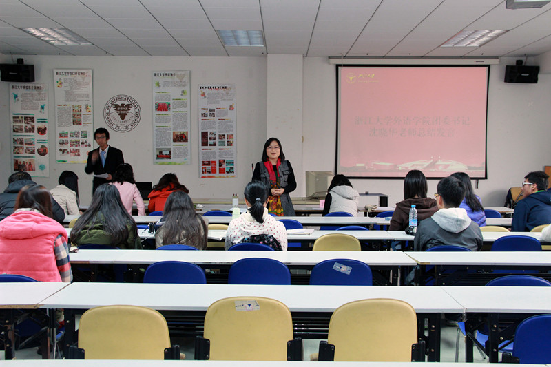 展示过后,沈晓华老师就本次活动做了总结发言。发言从两个关键词出发:一、“感动”。沈老师结合自己大学时代的学生工作经历,激励大家不要畏惧学生干部工作中的不易与困难,而是要以一种更加坚定的为同学们服务的态度和责任去处理班团任务。所以当沈晓华老师看到学生干部们都尽心尽责地为自己的团支部、为外院团委的建设尽心尽职、出谋划策的时候,她向同学们表达了由衷的感谢。二、“创新”。创新来源于对传统文化的提升,亦来自于对身边问题的发现和改善。如何以最有效的方法解决实际中的小问题,其实是一门思想的艺术,是考验同学们创新思维和解决问题能力的。综合来说就是,同学们要在会思考的同时努力实践,从思考和观察中创新,在困难和不易中进步。
