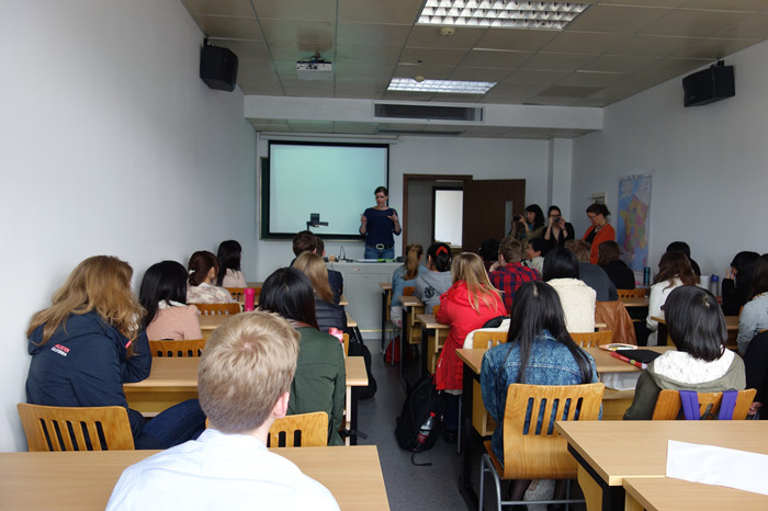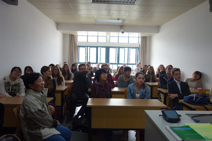 学院团委书记沈晓华老师亲自迎接了这批德国师生,并将他们带到德语外教Katharina Simpson老师的班上,并与班上20余名德语专业学生及德语老师邵勇进行亲切友好的交流。Katharina Simpson见到来自祖国的学生们感到非常激动,热情地与他们进行交谈。在交谈中,Simpson老师向大家介绍了自己的工作。作为DAAD(德意志学术交流中心)派驻浙大德国学研究所的语言专家,Simpson老师非常期待这些学习中文并愿意了解中国的学生,也能成为中德语言文化交流的中流砥柱。之后,大家就中德日常生活的异同等话题开展了积极的讨论。