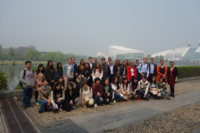 交流结束后,在邵勇老师带队之下,德语班学生陪同德国学生代表团参观了浙江大学紫金港校区。大家由东五教学楼出发,穿过东一教学楼来到启真湖畔,感受春日融融中的紫金港的湖畔风情。在咏曼阁边,大家共同拍照留念,记录这次因难得而更显珍贵的相遇。