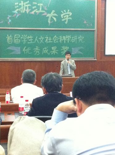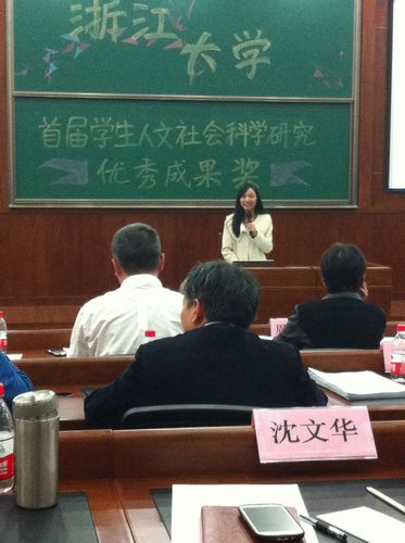 浙江大学首届学生人文社会科学研究优秀成果奖答辩暨颁奖典礼于2014年4月11日下午在紫金港校区西一107报告厅进行。本次评比共受理169项申报成果,经过初审、通讯评审、会议复审和网上公示,产生33项入围成果奖,其中20项进入答辩评审环节。本次答辩委员会由浙江大学社会科学研究院院长余逊达教授、中国西部发展研究院常务副院长周谷平教授、经济学系主任叶航、古籍研究所所长王云路教授等教授组成。浙江大学林建华校长、罗卫东副校长等校领导出席了本次颁奖典礼。