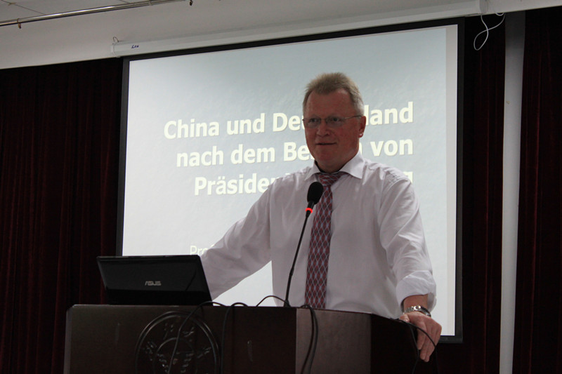 5月22日下午,应德国所研究所的邀请,德国著名智库外交政策协会研究所所长、德国柏林自由大学政治学教授、著名中国问题专家桑德施奈德(Eberhard Sandschneider)在东五201举行了一场题为“习主席出访德国后的中国与德国”的报告。报告由国懿老师主持,德国学所范捷平教授、陆伸老师、刘悦老师、沈国琴老师、邵勇老师出席,报告吸引了本科生、硕士生和博士生近百人前来聆听。