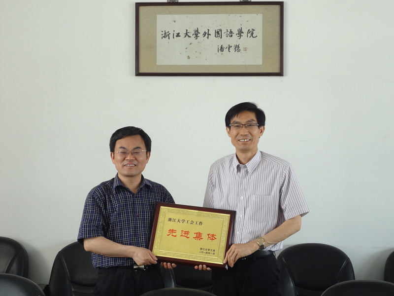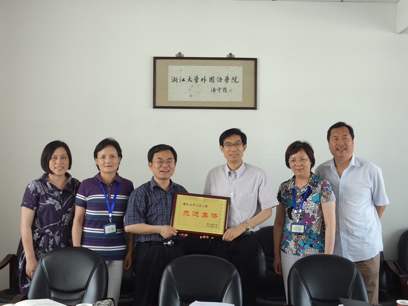 在校工会开展的2010-2013年工会工作先进集体和工会积极分子的评选活动中,外语学院工会荣获了浙江大学工会工作先进集体称号,吴昶、卢玲伟两位老师荣获了浙江大学工会工作积极分子称号。6月9日下午,校工会主席楼成礼老师,副主席王勤、毛晓华老师,工会办公室主任徐宝敏老师一行,专门到外语学院送来了奖牌。外语学院党委书记兼副院长褚超孚老师带领院工会主席姚娅萍老师、原院工会主席吴昶老师、卢玲伟老师等接受了奖牌。之后双方就院校两级工会工作进行了交流。