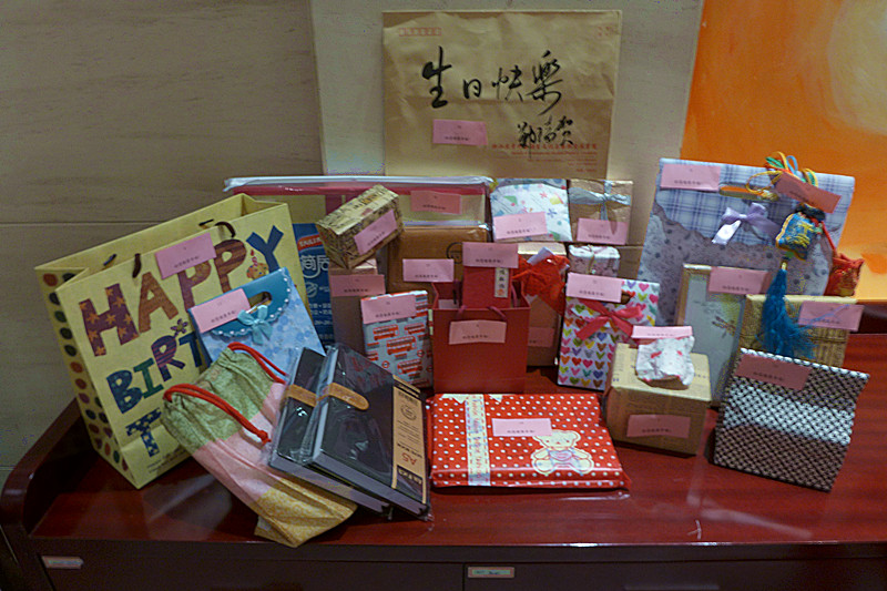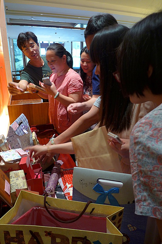 生日会上,来自不同语种、研究所的老师们三三两两地坐在一起,一边进餐,一边还不忘聊着工作、学生和生活。就餐之后,老师们以抽签的方式互赠了精心准备的生日礼物,有的是书籍或笔记本,有的是漂亮的挂架或首饰,有的老师还准备了自己的墨宝。每位老师在赠送别人一份惊喜的同时也从同事那里收获了另外一份惊喜。