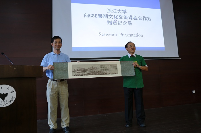 严建华教授代表浙江大学向中华文化交流基金会及香港大学代表谢诗贤先生赠送印有浙江大学紫金港校区及浙江大学校歌的锦帛。全场师生合唱浙江大学校歌。出席闭幕式的领导嘉宾向所有导师、助教及营员颁发了证书,并合影留念。在闭幕式第二阶段中,本期CSE暑期文化交流课程各组同学进行了团队展示。在团队展示中,各组同学或载歌载舞,或反串演出,或煽情动人,或热情洋溢,都以自己的方式很好地总结了为期近半个月的CSE所带给他们的知识、感动与友谊。