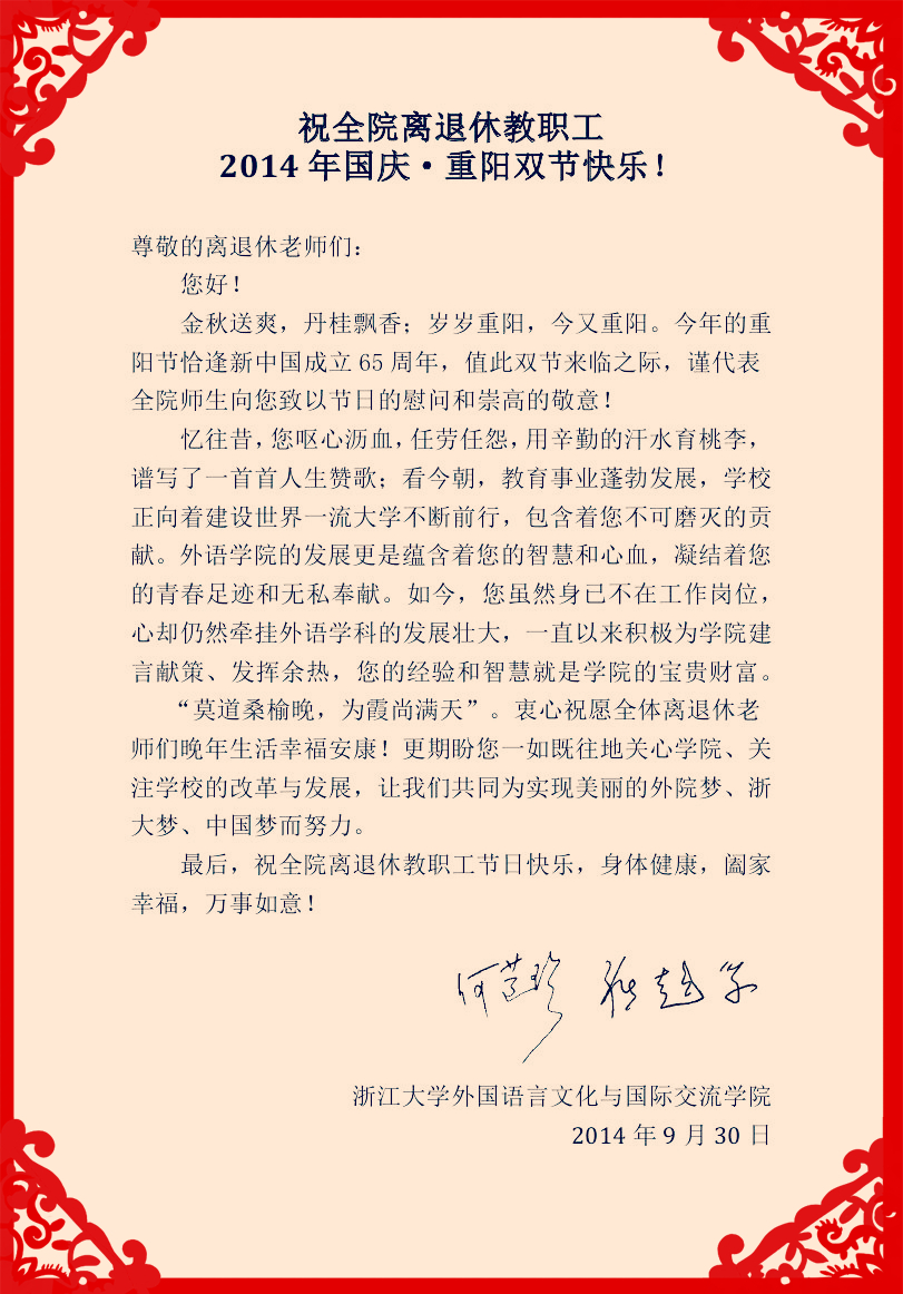 祝全院离退休教职工2014年国庆·重阳双节快乐!