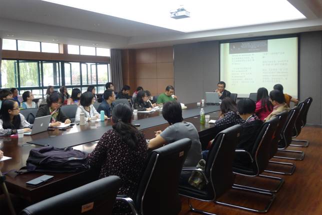 刘教授首先便直入主题,提纲挈领地抛出“所有文本都是互文性的”(All texts are intertextual.)”这一互文性理论的核心主张,同时指出这一概念中包含的两个关键点:“text”(文本、纤维、编织)和“deja”(已经、过去的),然后对“text”一词进行历史语境解读,追溯其在希腊、罗马神话中的隐喻线索;认为互文性挑战了阅读与写作对立的观点,并介绍其呈现方式:符号的极端多义性,文本与另一文本之间的转换关系等。之后,刘教授就重点阐述了克里斯蒂娃的互文性理论,认为克里斯蒂娃是对索绪尔关于语言符号意义的共时性生成和巴赫金对话性话语中主体、社会意识形态、历史等意义的“混搭”,同时也与巴特对语言的历史性,文本文学性和作者意识的忽略等观点不甚相同。她认为文本空间由写作主体,写作对象,外部文本等组成,文字符号有“双层次”界定,即横向轴上文学作品里的关系,依然保存对作者意识及文学性的尊重,以及纵向轴上文学文本与其他文本的关系,因而文学研究是一个纵横交错的过程。最后,刘教授通过具体的例证介绍了互文性理论在文艺理论领域的交叉运用和影响,如文学史观,女性主义解读,后殖民主义解读,当代文化生产阐释等。