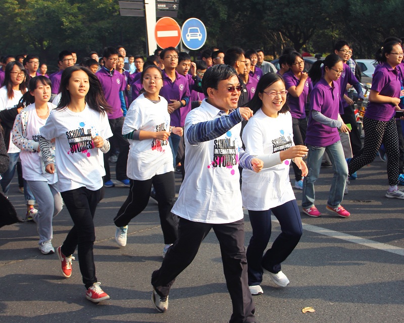 随后,在激越的鼓声中,各代表队的师生们响应主办方号召,开始了运动会的首个项目——万人阳光长跑。外院200名同学们在学院党委书记兼副院长褚超孚老师和党委副书记沈燎老师的带领下,精神饱满地踏上了跑道。据了解,与去年相比,今年阳光长跑参与人数大幅增加,总人数达到了11000余人。其中,外院学子便达到了200人。外院师生积极参与万人阳光长跑,充分体现了外院师生们参与体育锻炼的高涨的热情。