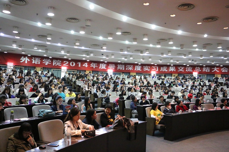 2014年11月7日下午两点,外语学院2014年度暑期深度实习成果交流总结大会在国际会议中心225举行。出席本次会议的嘉宾有本科生院教务处副处长游剑、党委学工部副部长李文腾、校团委副书记沈黎勇、本科生院实践教学办公室主任陈利华、校外实践基地代表、新华社“我在现场”客户端主编沈杭珍,外语学院副院长李媛、外语学院党委副书记沈燎以及外语学院各系、各专业负责人,本科教学科、团委相关科室老师,各实习项目指导教师等,外语学院本科生一、二、三年级以及研究生一、二年级学生均参加了此次总结大会。