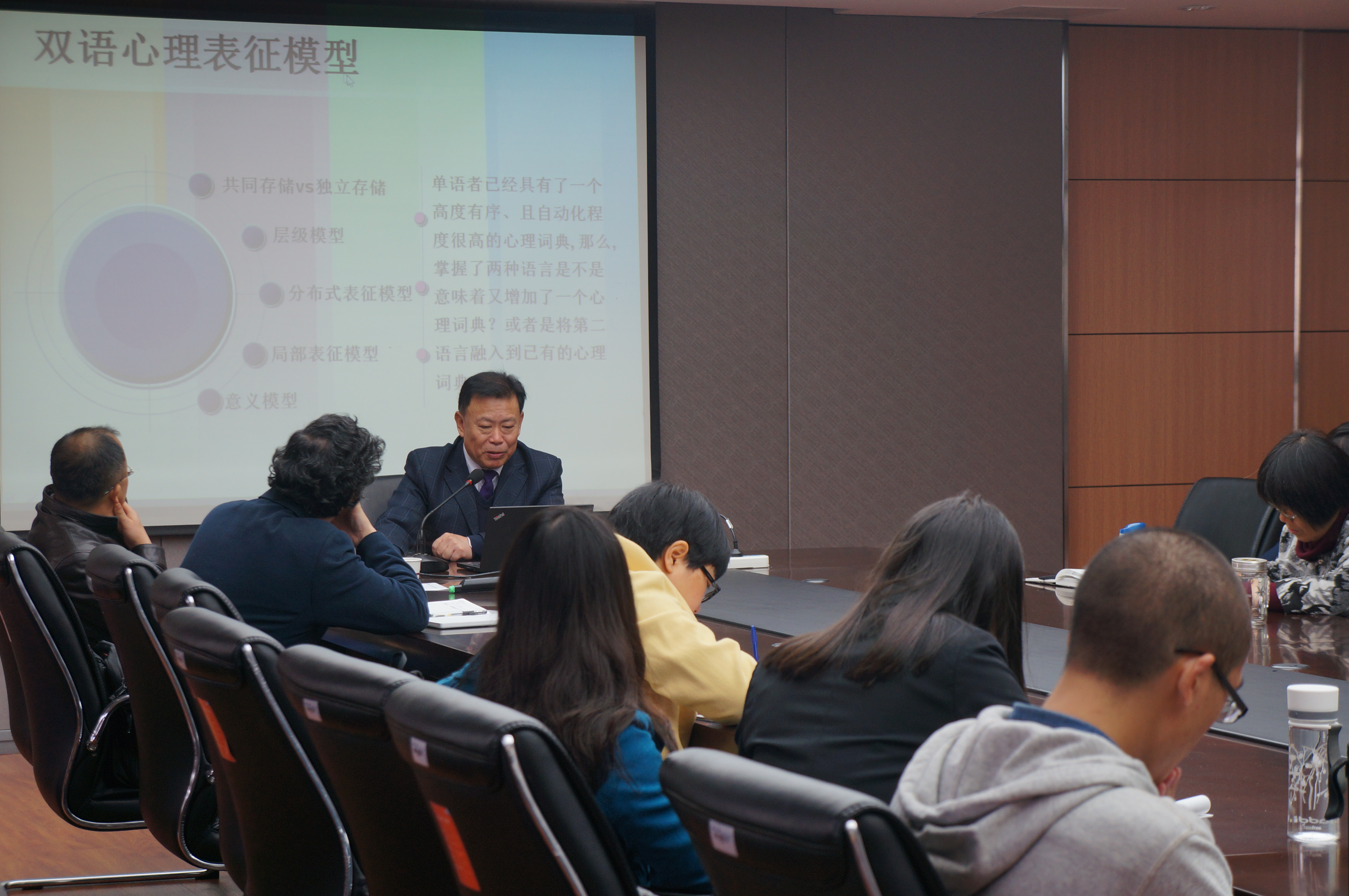 2014年11月19日上午9点,张积家教授给外语学院老师和同学们作了一场主题为“双语者和双言者的语言认知机制探讨”的学术讲座。张教授首先回顾了双语者和双言者的词汇语义表征的相关理论,指出双语者和双言者的语言认知机制是心理语言学的核心问题之一,再通过一系列实证研究来举证研究假设,主要包括:藏-汉-英双语者词汇语义表征研究、藏-汉-英双语者语言联系模式探讨、藏-汉-英双语者言词产生中的词汇选择机制、藏-汉-英双语者字词识别中的语码切换及其代价、双语和双言对图片命名和分类的不对称影响、汉-英双语者言语理解中语码切换的机制——来自亚词汇水平的证据、熟练汉-英双语者语码切换机制——来自短语水平的证据。上述系列研究从不同层面揭示了双语者和双言者的语言认知机制,使在座的每一位师生都受益匪浅。