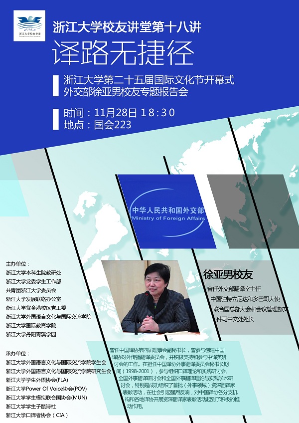 第二十五届国际文化节开幕式暨浙江大学校友讲堂第十八讲将于2014年11月28日(周五)在浙江大学紫金港校区国会223会议室隆重举行。届时将有浙江大学情绪智能(EQ)发展研究中心授牌仪式、国际文化节项目展示及徐亚男校友专题报告会——“译路无捷径”等精彩环节。本次国际文化节开幕式打破了以往的惯例,其目的在与借助国际化平台为更多有志于外交、翻译事业的同学搭建高水平、高起点的交流平台。希望通过此活动能够搭建起学生与专业机构的交流互通机制,让每一位有志于此的同学都能得到权威的指导并了解到该领域最新的发展动态!