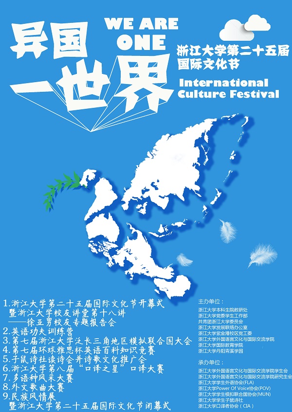 国际文化节是浙江大学各国学子文化交流、风采展示的舞台,是求是学子感受多元文化、开拓国际视野的契机。第二十五届国际文化节以“异国一世界 We Are One”为主题,推进教师、本校学生与留学生共同参与,与浙江大学发展联络办公室共同策划了浙江大学第二十五届国际文化节开幕式暨浙江大学校友讲堂第十八讲——徐亚男校友专题报告会。开幕式之后,本次国际文化节还将举行英语功夫训练营、第七届浙江大学泛长三角地区模拟联合国大会、第七届环球雅思杯英语百科知识竞赛、子鼠诗社读诗会并诗歌文化推广会、浙江大学第八届“口译之星”口译大赛、多语种风采大赛、外文歌曲大赛、民族风情展暨浙江大学第二十五届国际文化节闭幕式等精彩活动,