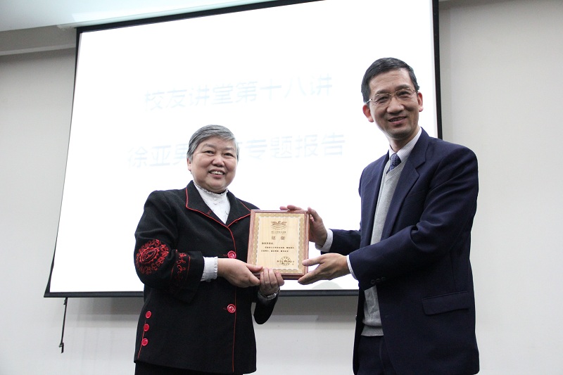 浙江大学党委副书记严建华老师为本次校友讲堂致辞,欢迎徐亚男校友返校,并为其颁发校友讲堂铭牌。徐亚男校友以“离开母校41年,再次回到母校,激动的心情难以平静”作为开场白,赢得了一片掌声。