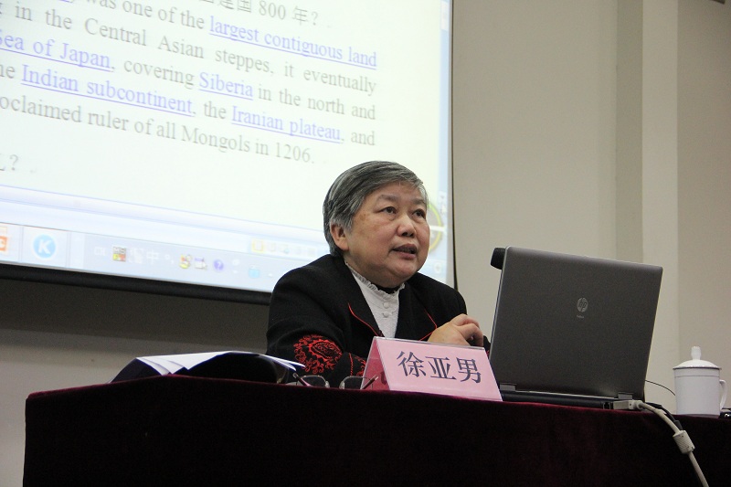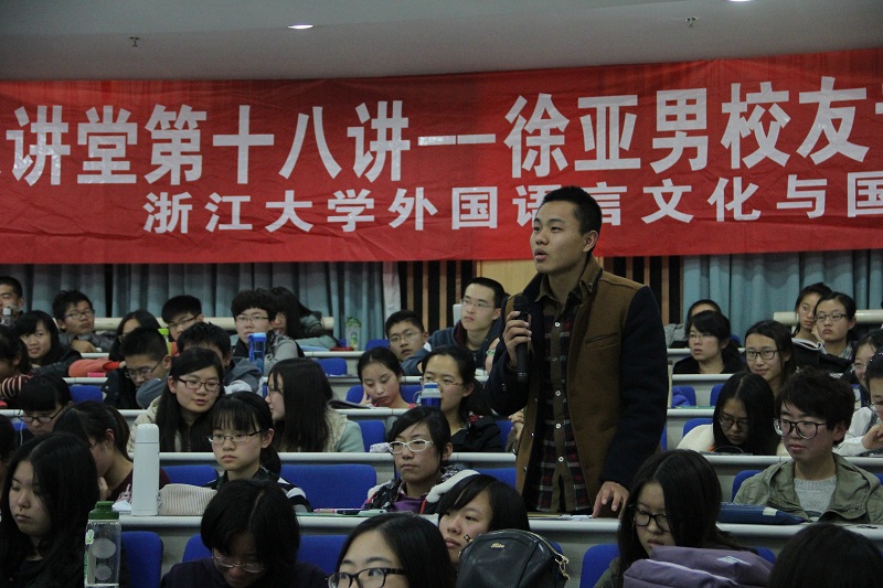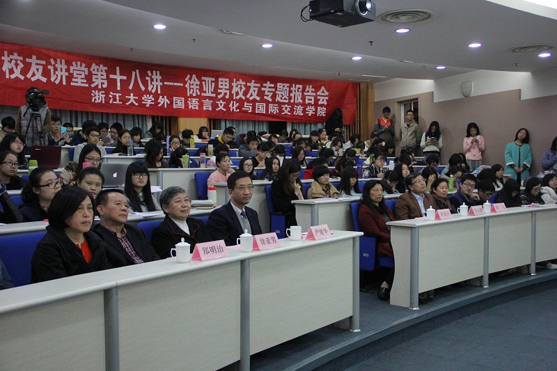 2014年11月28日晚6点半,浙江大学校友讲堂第十八讲——徐亚男校友专题报告会在紫金港校区国会223报告厅举行。浙江大学外语学院73届校友、原外交部翻译室主任、中国驻特立尼达和多巴哥大使、联合国总部大会和会议管理部文件司中文处处长徐亚男、浙江大学党委副书记严建华、党委学工部部长邬小撑、外语学院院长何莲珍、紫金港校区党工委副书记陈飞、外语学院校友分会名誉会长郑明治及外语学院党委副书记沈燎等出席了本次活动。报告会由沈燎主持。