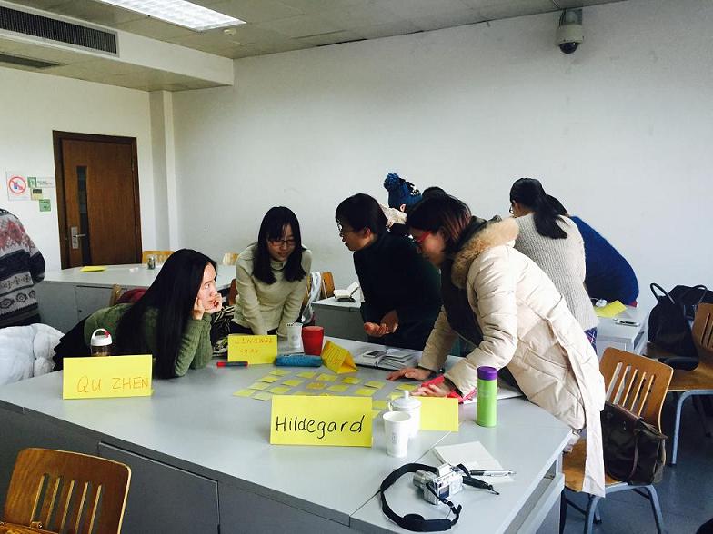 自我介绍环节过后,该是正式进入活动的主干部分的时候了。Caroline老师却请大家都站起来,分别以今晨的起床时间、名字的第一个字母与出生地的南北方位进行了三次排序站位。而就在大家不明就里完成了指令之时,Caroline老师介绍道,这就是一种有效的课堂开场的暖场活动。本次的研讨目的是介绍与讨论一系列在德语课堂教学中实用的教学方法。令人印象深刻的是,Caroline老师为大家带来的并不是简单的陈述,而是向介绍课堂暖场方式的方法一样,先请各位参与活动的老师扮演学生的角色,亲身体验每一种教学方法。在此之后,再系统地为大家解说这种方法,大家带着刚刚体验后的感受,讨论时即鲜活又有共鸣。一天的时间,Caroline老师从课堂游戏以及德语的听说读写五个方面为参与者介绍了二十余种教学方法,它们有的图文结合有的互动性很强,适合各种不同的教学内容。而老师们也感受了一把“Learning by doing”,在亲身投入到每一种教学方法的过程中,领会到每种方法的精髓和特点。每到休息时间,可以看到老师们意犹未尽地坐在一起,结合自己的教学实际讨论刚刚介绍的教学方法,它们有的是自己已经在教学中经常使用的,有的令人感到耳目一新,颇有启发。讨论过程中,Caroline还会邀请到场的学生从学生的角度谈谈学习中遇到的难点和对每种教学方法的学习体会,为老师们提供了另一方面的参考信息。