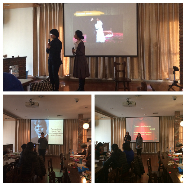 比赛由俄语所陈新宇老师策划主持,俄语所2013级学生组织协助,并邀请了包括两位外教在内的所里全体老师担任评委。参赛学生们表演的内容包括诗歌、小说、戏剧等体裁,囊括了19世纪和20世纪的俄罗斯文学经典。各年级学生精心准备,他们以生动的声音表现,恰到好处的表情和肢体语言进入他们所扮演的角色,在充分熟悉内容的基础上配以相衬的背景音乐和图画,重新演绎了普希金的四小悲剧之一的《石客》、小说《当代英雄》、《战争与和平》、《安娜·卡列尼那》 和《带小狗的女人》的经典片段,将台下的评委和观众带入了时而烦闷忧愁、时而淡然宁静,时而热烈澎湃的情绪波动之中。普希金、叶赛宁、丘切夫和阿赫马托娃的诗歌穿插其中,轮番上演,经典的魅力喷薄而出,耐人寻味。经过紧张激烈的角逐,最后,2013级两位同学诠释的普希金戏剧《石客》片段以流利的对白、应景的服饰、入木三分的精彩表演勇夺一等奖桂冠。