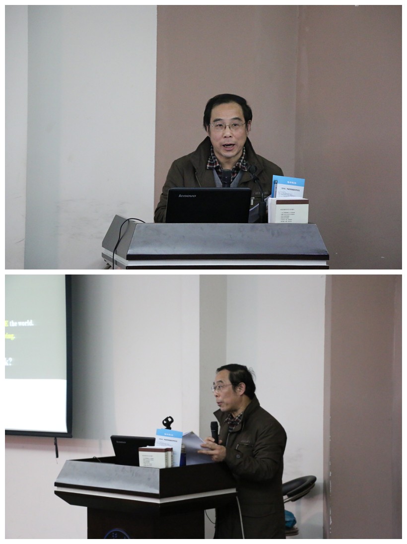 然后,高奋教授用“穿越”请出了范捷平教授的题为“文化人类学与移民家书研究”的报告。范老师从文化学转向与翻译学转向开始,带领大家了解了翻译学转向的文化学核心、身体实践核心和本体论核心,并向大家阐述了学术研究视野下的“翻译学转向”、霍米•巴巴的“翻译文化”以及家书的基本功能。他认为翻译学转向的目标是颠覆文化二元对立。不断地突破文化疆界,在不同的文化之间创造“交往空间”。