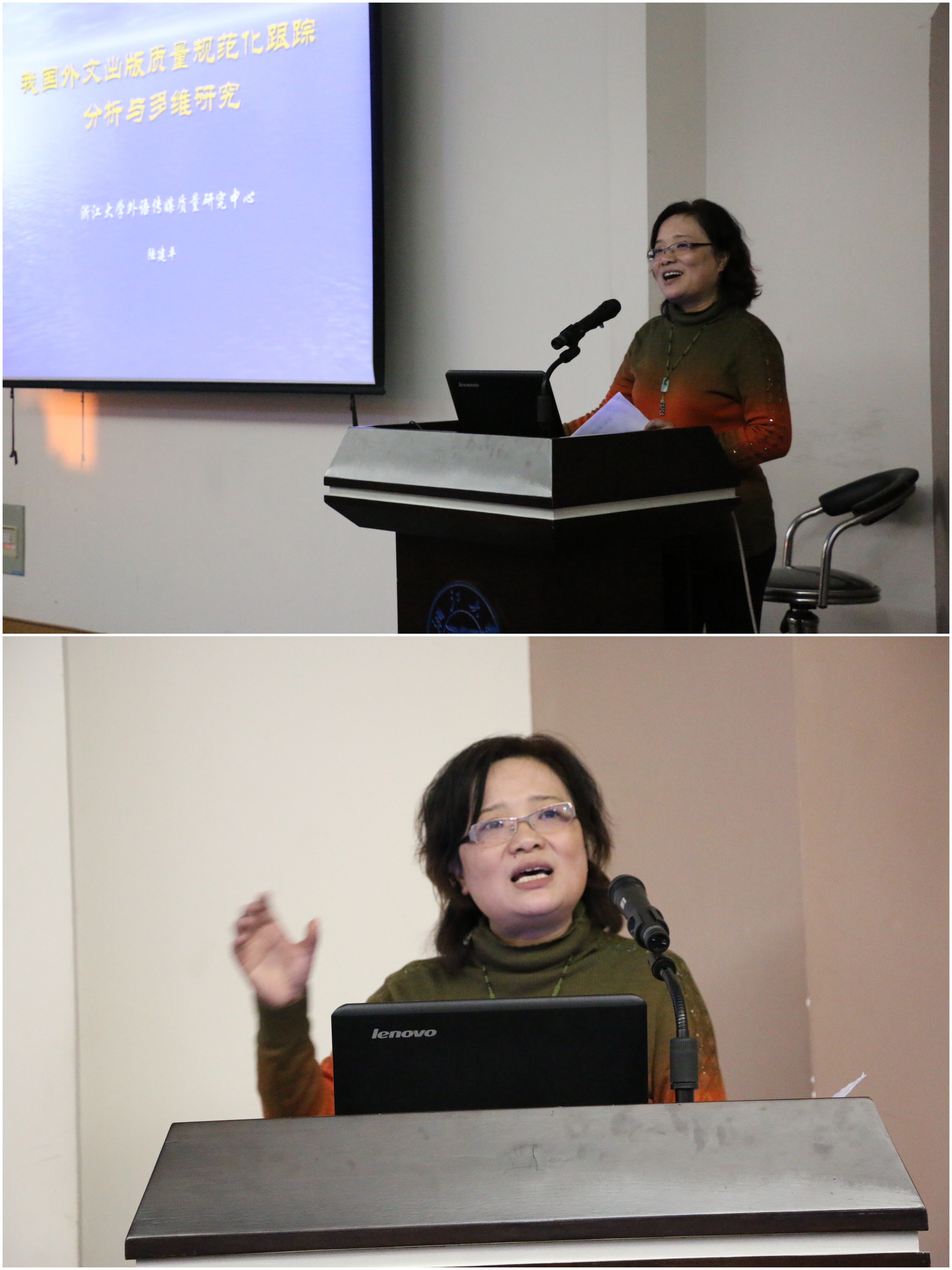 最后,浙江大学外语传媒出版质量研究中心主任陆建平老师做了“我国外文出版质量规范化跟踪分析与多维研究”的报告,她声情并茂地从研究中心的历史沿革和研究优势展开,谈了出版转型的内涵与外延内容,阐述了中心研究成果对语言学、传播学和教育学的贡献,以及未来的发展和面临的挑战。