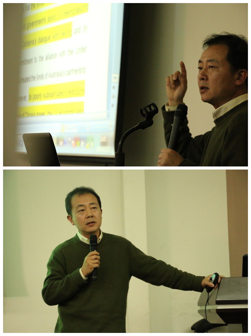 随后,施旭教授做了题为《涉中国防话语:解析2010-2014年以来的国外国防研究话语》的报告。他指出,国防话语的本质是文化话语现象,是文化权势和武装力量进行互动、竞争、合作的现象。因此,施教授在研究中,关注多元分析范畴,以多学科的视角对研究对象加以分析和阐释。在报告中,他介绍了研究所采用的“文化话语研究”和“当代中国话语研究”理论框架,同时,围绕话语对象、话语基础、话语思维、话语修辞、话语主体和话语渠道等七个维度对国外涉及中国国防相关研究的话语进行解析与批判,并为我国国防事业的发展提出了相关建议。