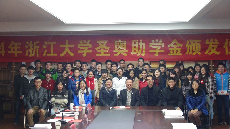 沈燎老师首先向大家介绍了出席本次仪式的嘉宾,并详细介绍了郑会长与浙大的渊源及浙江圣奥慈善基金会的历史。随后,2014年度浙江大学圣奥助学金颁发仪式正式开始,郑明治会长为受助学生颁发了助学金,并在颁发时与学生进行轻松的交流,让受助学生感到情切和温暖。颁发仪式结束后,郑会长及所有到场的老师与受助同学一起合影留念。