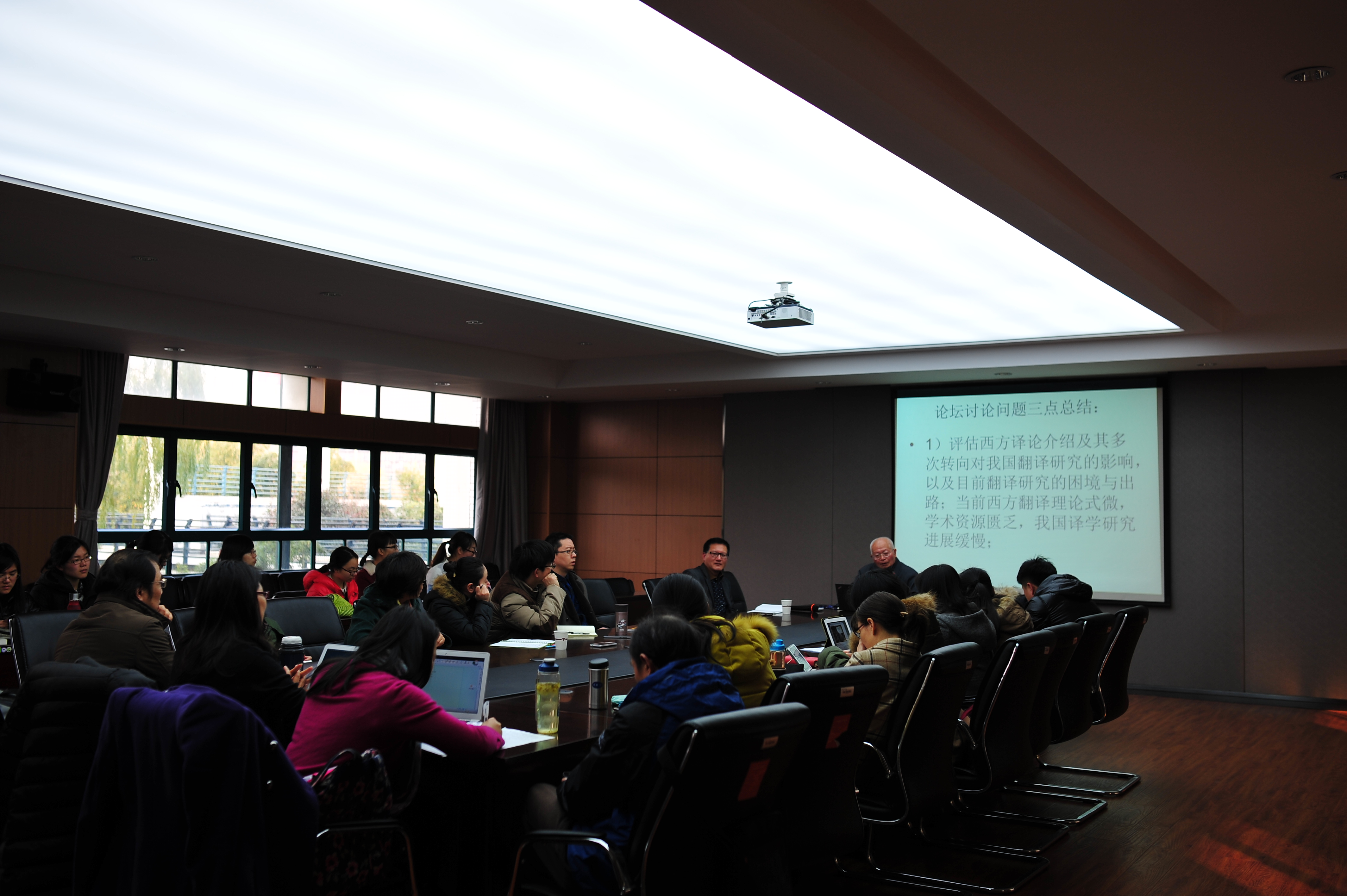 郭建中老师首先回顾了他刚刚参加的全国翻译研究战略论坛,总结了论坛讨论的主要问题。郭老师认为此次论坛为我国当代翻译理论的发展与创新提供了新的研究视角和研究方法,解答了当下翻译学发展的某些困惑,并为中国译论的构建进行了有益的探索,对今后一个时期我国翻译理论的积极、健康发展提出了新锐的见解。