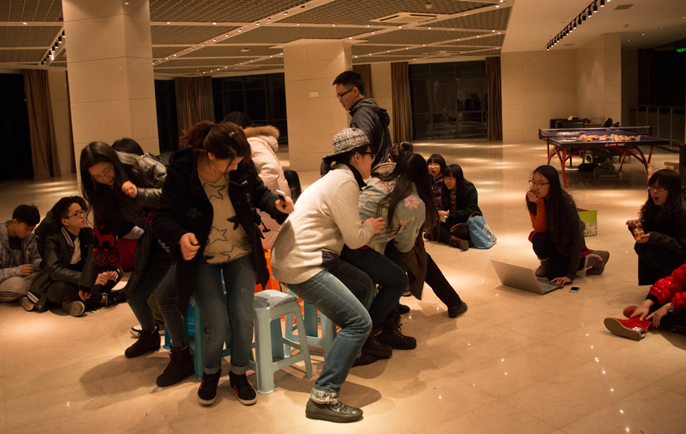 晚上18点半,新年狂欢会拉开了大幕。首先是由2014级学生会主席刘懿带领着大家一起玩暖场游戏——抢凳子。这简单而趣味浓浓的小游戏迅速调动了现场气氛。同学们踊跃地参与到游戏中,欢声笑语回荡在大厅里。接着在大家的期待下,团总支对“献给祖国的三行情书”的获奖者进行了颁奖。