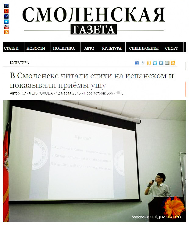 研讨会主要目的为加强多方合作和促进青年组织、高校学生的经验交流,发展俄罗斯同其他国家的互信合作。在斯摩棱斯克国立大学留学的浙江大学外语学院俄语所13级研究生李昊天参加该会议,并作为中国代表团代表以《中国在独联体地区的国际形象》为题作大会发言。李昊天同学结合前期的调查和现有的学术观点,以数据和事实为依托,逐一对中国的国际形象做分析,解释了一些容易被独联体国家民众所误解的现象。发言过程中语言幽默,图文并茂,现场笑声与掌声不断,得到了与会师生的一致好评。会后被主办方大会表彰并授予奖状、奖品,并接受《斯摩棱斯克报》采访。