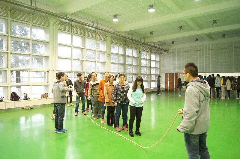 之后,团队合作训练正式开始,本次课程由张帆老师组织带领。课程第一个环节是跳大绳,若每班在10分钟内完成所有成员齐跳10下的任务,便能获得50分。计时开始后,大家纷纷出谋划策,尝试了各种方式,虽然最后都没能在规定的时间内完成任务,但是大家都从中发现了问题,得到了感悟。在随后的分享环节中,部分学员意识到了一开始时的混乱场面来自于无领导组织,如果能有统一的口号,则可提高效率和完成度。通过这个环节,大家了解了一个团队中领导的重要作用。