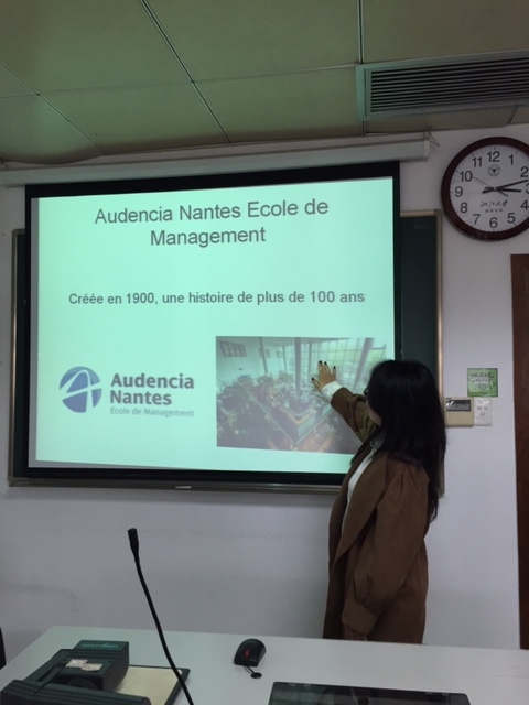 首先,赴法交流归来的大三同学们与大家分享了他们在国外高校的学习经历。各位在法国巴黎政治学院、南特商学院和里昂三大交流学习的同学们分别用法语向大家介绍了在不同学校的课程学习情况,涉及语言、文学、政治、经管类的课程,展示了学习所得,让我们领略了法国学校的课堂风格,感受到了国内外学习的差异。