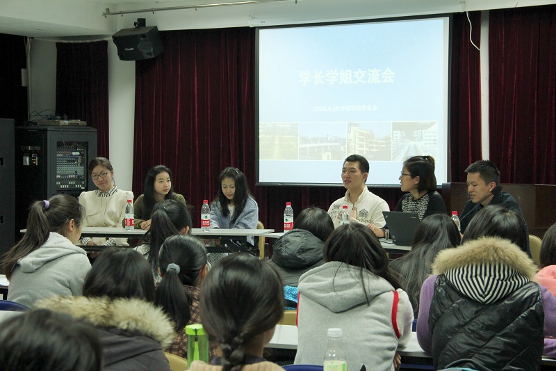 4月10日晚7点,外语学院学生会学长学姐交流会暨春夏学期内部培训会在东五201(中)举行。此次交流会邀请了现任外语学院学生会主席王玥以及往届外语学院学生会主席薛倩、刘四方、金菁华和任碧芸担任嘉宾。外语学院学生会秘书长李旭桦老师也受邀出席。