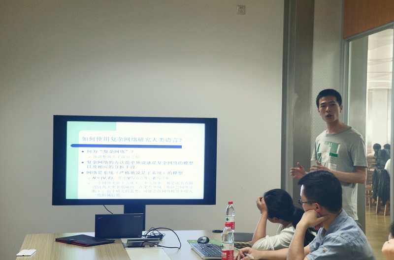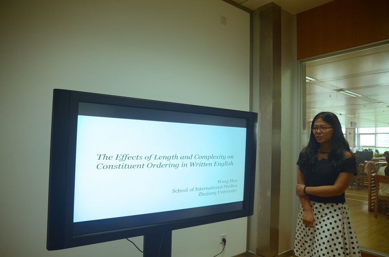 第三位主讲人王华是外国语言文化与国际交流学院13级博士生,主要研究方向是语言序列的计量研究。她此次交流内容为“长度和复杂度对英语书面语中词序的影响”。之前的研究显示,语言使用者一般倾向于把最难的词放在句子的最后,最容易的词放在句子开头,但很少有人用大型语料库研究过整个句子的词语位置。王华选取了国际英语语料库中的书面语部分,发现词语的长度和复杂度确实会影响其在句中的位置,验证了之前句子开头的词一般长度短、复杂度低,末尾的词长度长、复杂度高的说法。