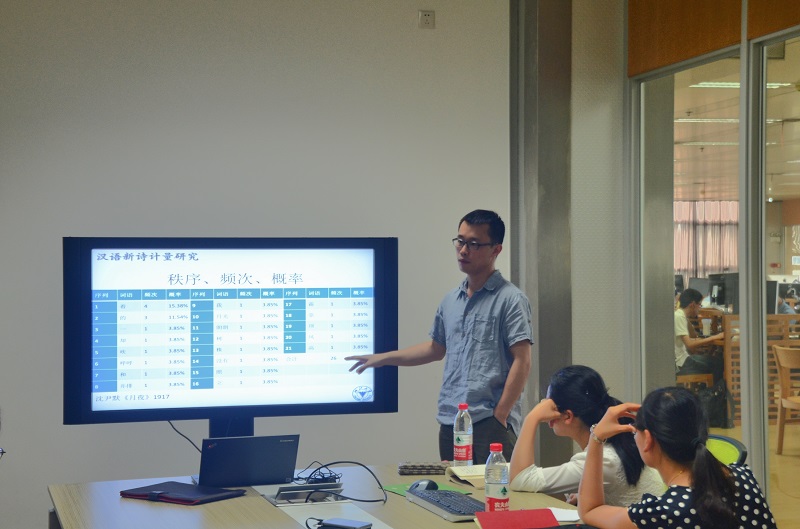 潘夏星是人文学院12级博士生,主要研究方向为汉语计量研究。这次,他分享的内容 “汉语新诗的计量特征”就为我们解答了这一疑惑。他的研究分为三个部分,第一部分选择了近体诗和新诗各十首,在统计名词和动词在文本中出现的概率后发现,近体诗和新诗之间各自聚类,但彼此又有交叉,这说明两者并没有彻底断裂。第二部分探究了词频分布是否符合齐普夫定律。统计显示散文很好地拟合了齐普夫定律,但诗歌并不符合该定律,这说明作者在诗歌的创作过程中对词的操控能力比散文强。第三部分则对60首诗歌中的音节数、次数和停延数进行统计,试图寻找诗歌分行与节奏的特点。