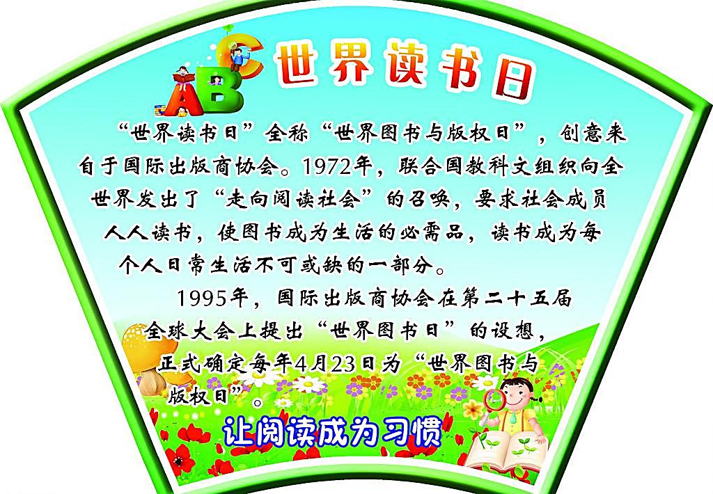 世界读书日全称为世界图书与版权日,又称“世界图书日”,最初的创意来自于国际出版商协会。1995年联合国教科文组织正式宣布4月23日为“世界读书日”,设立目的是推动更多的人去阅读和写作,希望所有人都能尊重和感谢为人类文明做出过巨大贡献的文学、文化、科学、思想大师们,保护知识产权。每年的这一天,世界100多个国家都会举办各种各样的庆祝和图书宣传活动。世界读书日来源于西班牙加泰罗尼亚地区的一个传说:美丽的公主被恶龙困在深山,勇士乔治只身战胜恶龙,解救了公主;公主回赠给乔治的礼物是一本书。从此书成为胆识和力量的象征。