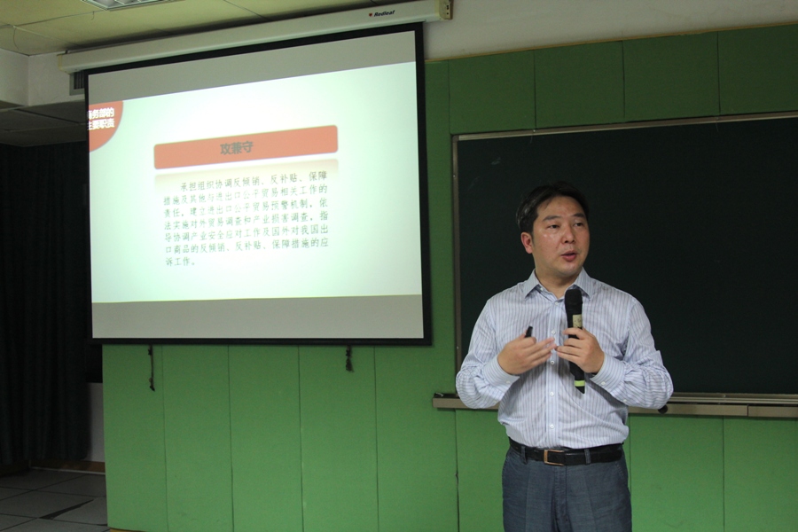 其次,郑处长从“内外贸、多双边、攻兼守、斗与和”四个方面简明扼要地向学生介绍了商务部的主要职责,同时讲解了商务部的机构设置及其“人数多、内设机构多、机构类型复杂”的特点,使同学们对商务部有了初步的了解与认识。