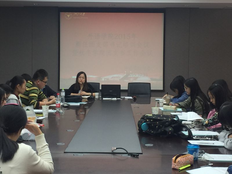 为进一步推进基层团组织建设,践行社会主义核心价值观,提升团员骨干的工作能力,2015年10月13日中午12点30分,外语学院召开了新学期全体团支书培训会议。出席本次会议的有团委书记沈晓华老师、团委副书记李旭桦老师、团委书记助理江悦铃等团委学生骨干、本科生及研究生各年级团支书等。