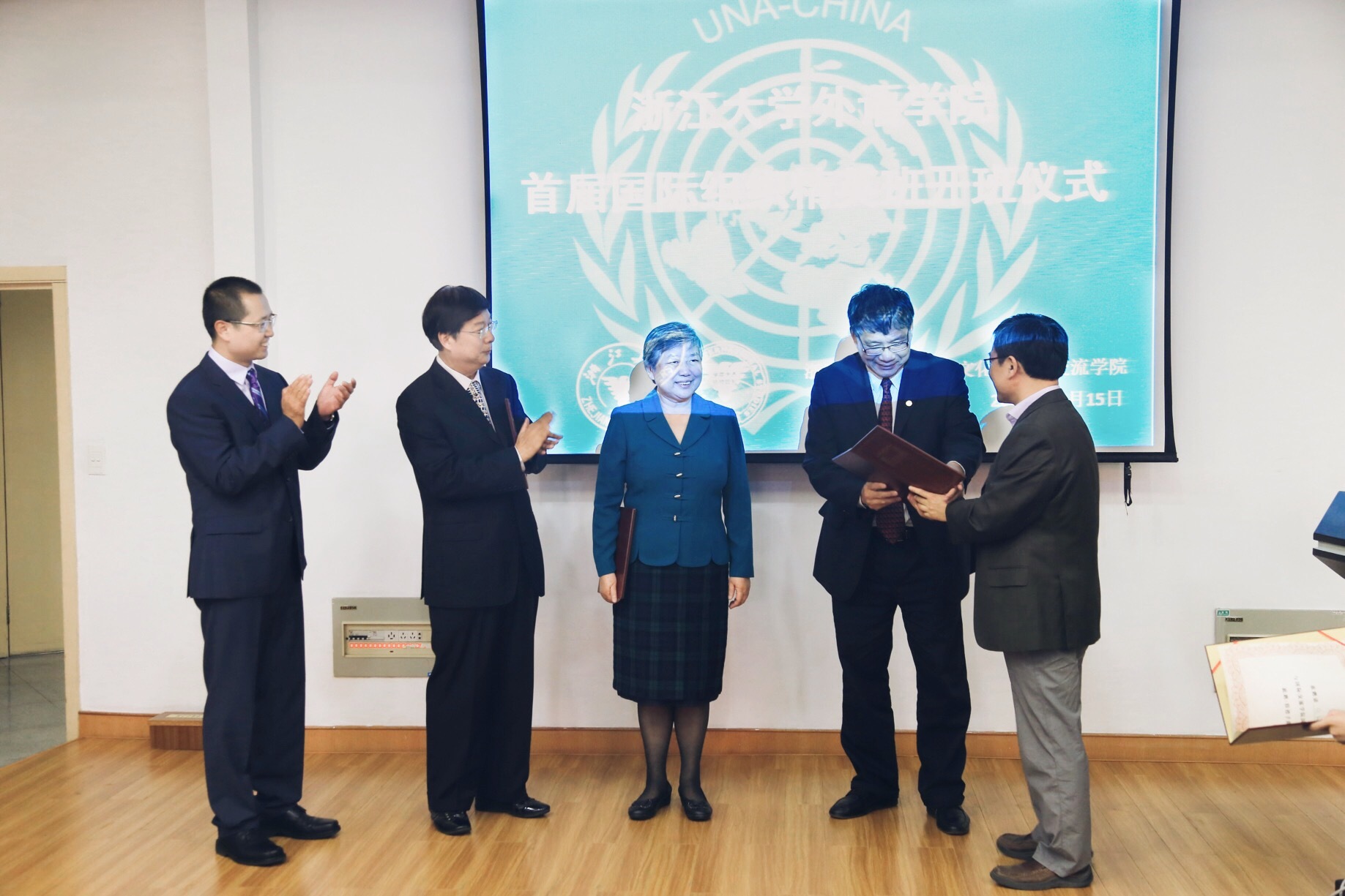 2015年10月15日,浙江大学外国语言文化与国际交流学院首届国际组织精英班开班仪式在国际会议中心223举行。浙江大学副校长严建华,中国联合国协会副会长兼总干事刘志贤,中国驻特多前大使、联合国大会和会议管理部文件司前中文处处长徐亚男,中国-上合组织国际司法交流合作培训基地协调员王蔚,中国联合国协会副处长张毅,浙江大学研究生院、本科生院、外事处、中国学中心等部门的领导以及浙江大学外国语言文化与国际交流学院相关领导与同学参与了本次仪式。开班仪式由浙江大学外国语言文化与国际交流学院院长何莲珍教授主持。