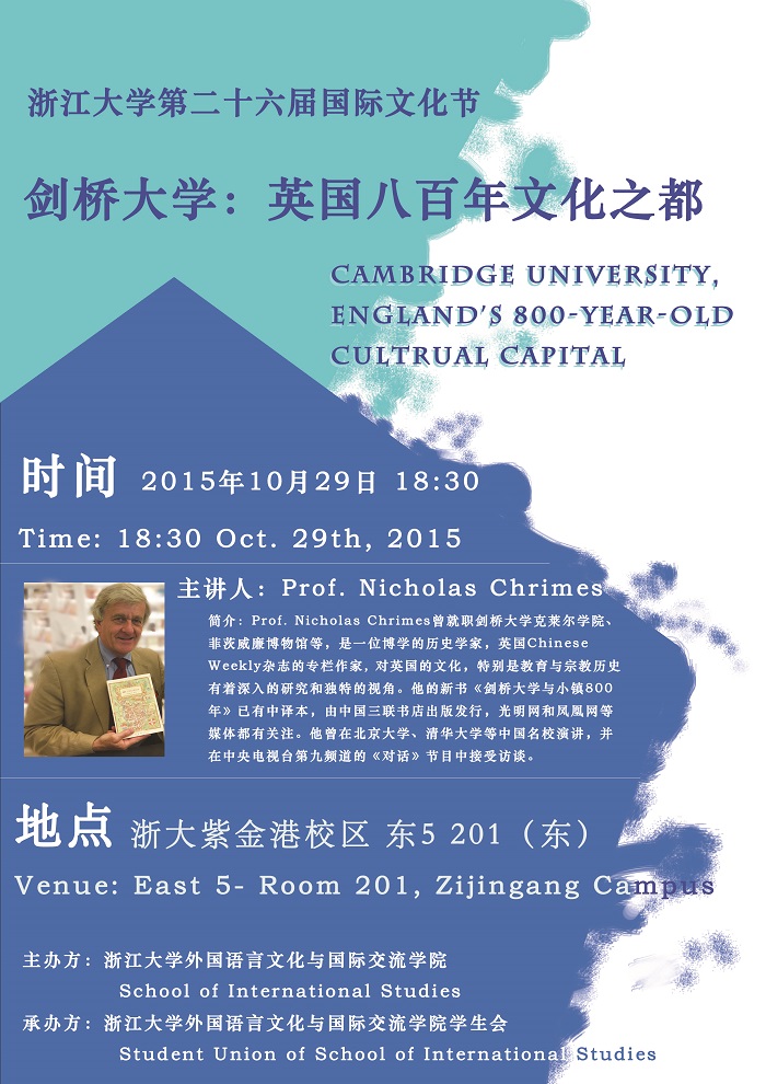 Prof. Nicholas Chrimes:曾就职剑桥大学克莱尔学院、菲茨威廉博物馆等,是一位博学的历史学家,英国Chinese Weekly杂志的专栏作家, 对英国的文化,特别是教育与宗教历史有着深入的研究和独特的视角。他的新书《剑桥大学与小镇800年》已有中译本,由中国三联书店出版发行,光明网和凤凰网等媒体都有关注。他曾在北京大学、清华大学等中国名校演讲,并在中央电视台第九频道的《对话》节目中接受访谈。