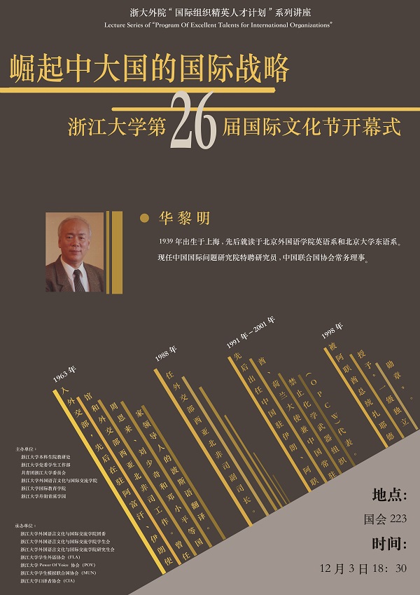 第二十六届国际文化节开幕式暨华黎明大使专题讲座将于2015年12月3日(周四)晚18:30在浙江大学紫金港校区国会223会议室隆重举行。届时将有国际文化节各项目展示及华黎明大使专题讲座——“崛起中大国的国际战略”等精彩环节。本次国际文化节开幕式打破了以往的惯例,其目的在与借助国际化平台为更多有志于外交事业的同学搭建高水平、高起点的交流平台。希望通过此活动能够搭建起学生与专业机构的交流互通机制,让每一位有志于此的同学都能得到权威的指导并了解到该领域最新的发展动态!